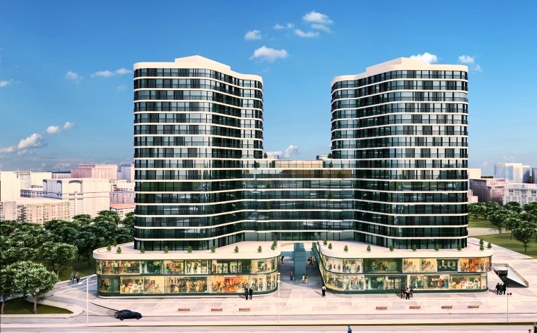 The project consists of two blocks with a height of 17 floors, containing 172 apartments and 78 shops