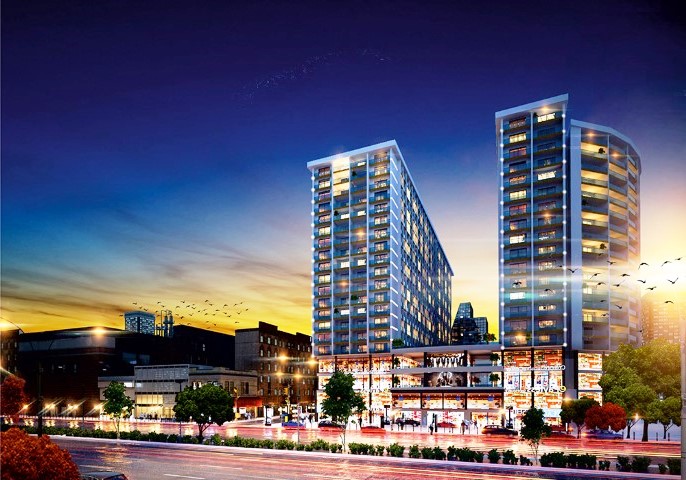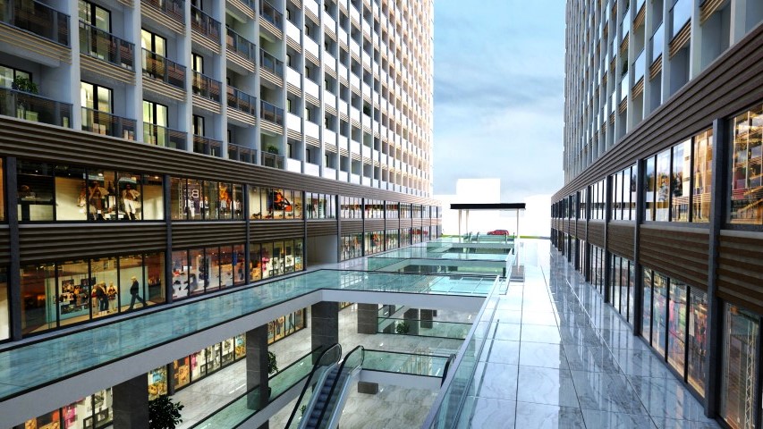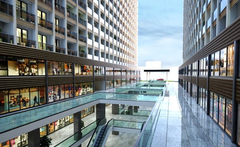 The project consists of two blocks containing 474 apartments and 160 offices, with a shopping mall containing 126 stores
