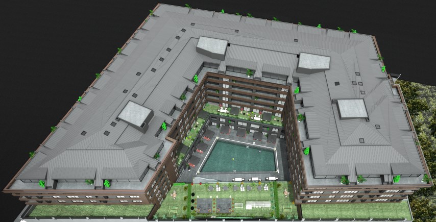 A building consisting of two connected blocks to form a U-shape, as the idea of the project’s shape is to create a private interior space that is not closed at the same time.