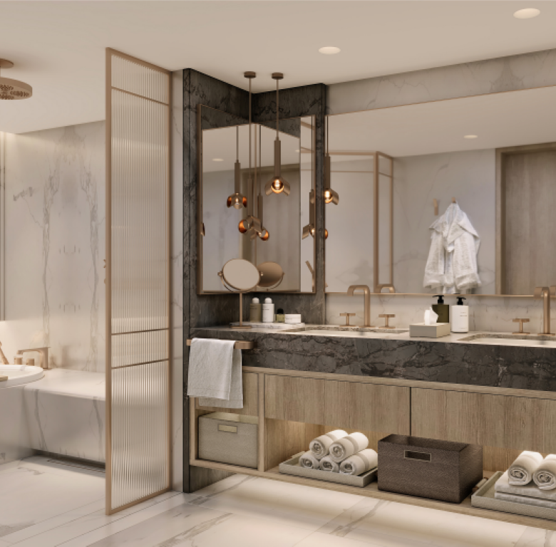 مطابخ حديثة بخزائن ومساحات تحضير مريحة، وتجهيزات صحية بمعايير عالية.