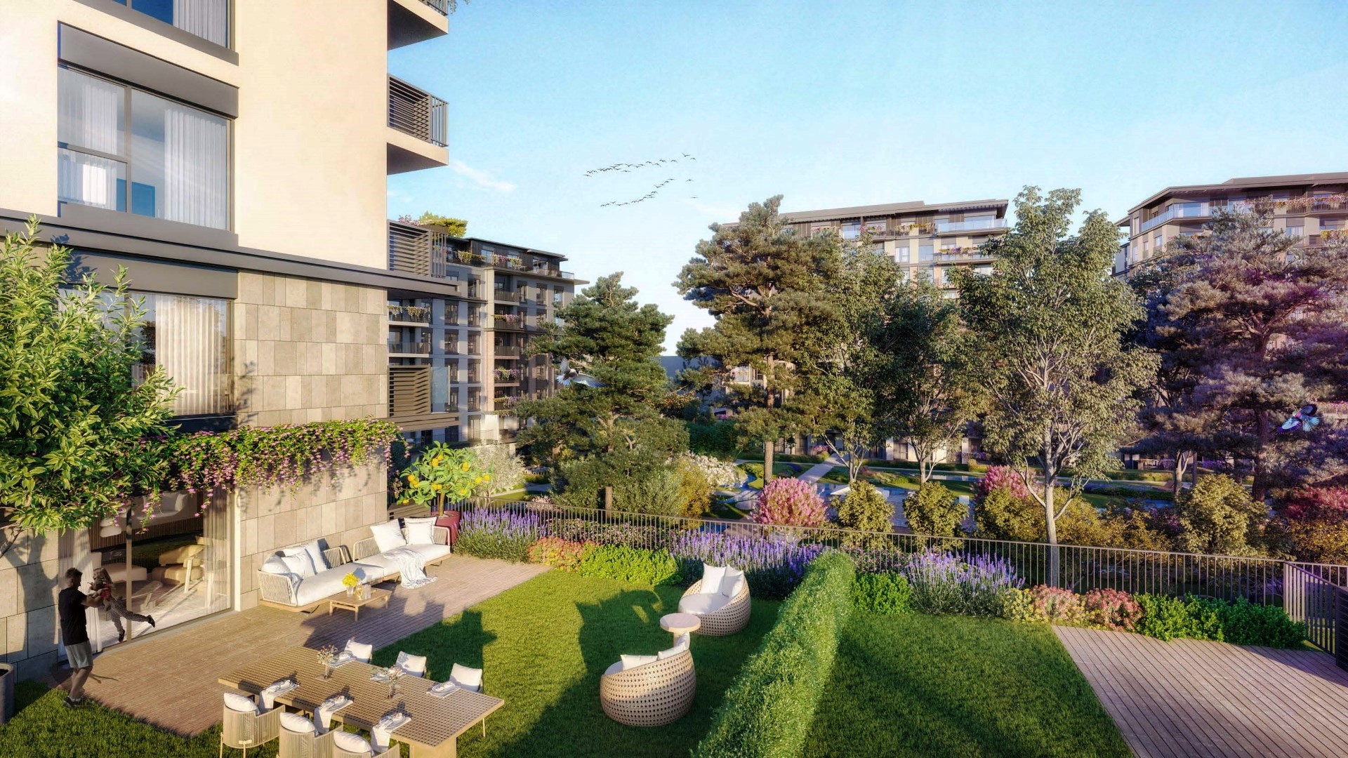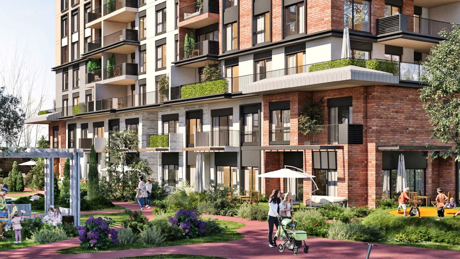 مباني منخفضة الارتفاع بتصميم أفقي مع تصميم معماري مميز مع عناصر طبيعية ، 85٪ من المساحات الخضراء ، 50٪ منها بجانب الغابة أو الغابة ، جميع الشقق لها شرفة أو تراس خاص بها.